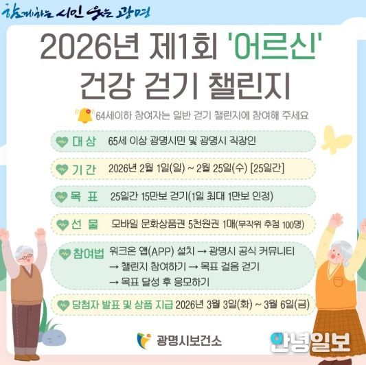 안녕일보 배윤 기자 | 광명시가 오는 2월부터 모바일 걷기 플랫폼 ‘워크온(WalkOn)’을 활용한 걷기 챌린지 방식을 개편하고, 65세 이상 시민을 위한 ‘어르신 걷기 챌린지’를 별도로 운영한다고 21일 밝혔다.