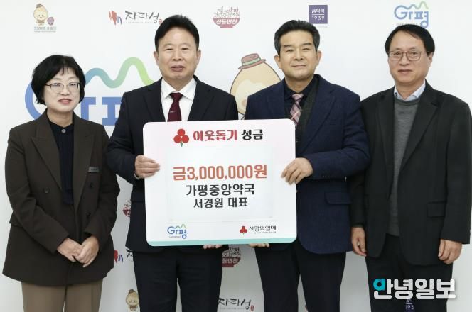 안녕일보 배윤 기자 | 가평중앙약국 서경원 대표는 21일 이웃돕기 성금 300만원을 가평군에 기탁하며 지역사회 나눔 실천에 동참했다.