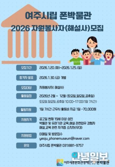 안녕일보 배윤 기자 | 여주세종문화관광재단은 여주시립 폰박물관의 전시 콘텐츠를 관람객에게 보다 쉽고 흥미롭게 전달할 자원봉사자(해설사)를 모집한다고 밝혔다.