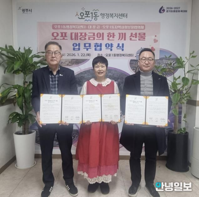 안녕일보 배윤 기자 | 광주시 오포1동은 지난 22일 지역 내 음식점 대장금, 오포1동 지역사회보장협의체와 함께 저소득 취약계층의 식생활 지원을 위한 ‘오포 대장금의 한 끼 선물’ 업무협약을 체결했다.