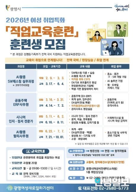 안녕일보 배윤 기자 | 광명시가 경력단절 여성과 재취업 희망 여성의 경제활동 복귀를 돕기 위해 ‘2026년 맞춤형 직업교육훈련’ 과정을 운영한다.