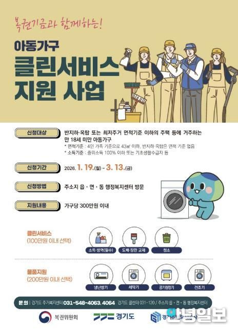 안녕일보 배윤 기자 | 용인특례시는 ‘복권기금과 함께하는 아동가구 클린서비스’ 사업 대상자를 모집한다고 26일 밝혔다.