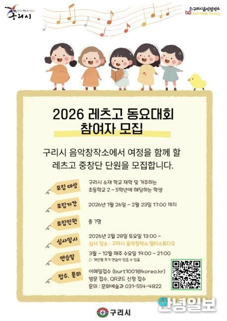 안녕일보 배윤 기자 | 구리시는 오는 3월부터 추진하는 'Let’s Go! 동요 대회' 사업에 참여할 학생을 2월 23일까지 모집한다고 밝혔다.