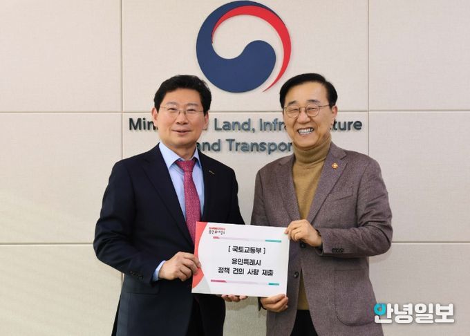안녕일보 배윤 기자 | 이상일 용인특례시장은 26일 정부세종청사에서 김윤덕 국토교통부 장관에게 ‘용인 첨단시스템반도체 클러스터 국가산업단지’ 정상 추진과 경기남부광역철도 ‘제5차 국가철도망 구축계획’ 반영 등 시의 주요 현안을 설명하는 자료를 건네고 국토교통부 지원과 협조를 요청했다.