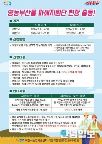 신청 대상은 농업경영체에 등록된 농업인이며, 신청 기간은 4월 10일까지이다. 신청은 이천시농업기술센터 영농기술팀 또는 식량작물팀으로 하면 된다. 현장 파쇄작업은 2월 19일부터 4월 30일까지 진행된다.