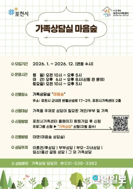 최선희 포천시가족센터장은 “가족상담실 ‘마음숲’은 가족 구성원 간 상호 이해를 높이고 관계 회복을 돕는 역할을 꾸준히 수행해 왔다”며 “앞으로도 부부와 부모‧자녀, 청소년 등 다양한 가족이 필요할 때 전문적인 상담을 받을 수 있도록 지원을 이어가겠다”고 말했다.