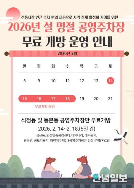 안녕일보 배윤 기자 | 안성시시설관리공단은 2026년 설 명절을 맞아 2월 14일부터 18일까지 5일간, 공단이 관리하는 공영주차장 중 전통시장 인근에 위치한 석정동 공영주차장과 동본동 공영주차장을 한시적으로 무료 개방한다고 밝혔다.