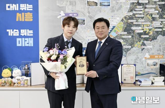 안녕일보 배윤 기자 | 시흥시는 인기 경연 프로그램 ‘미스터트롯2’ 출신 가수 진욱을 시흥시 명예문화홍보대사로 위촉하고, 1월 28일 시장실에서 위촉장을 전달했다.