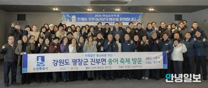 안녕일보 배윤 기자 | 수원시 팔달구 인계동은 지난 29일, 인계동 주민자치회 등 단체원 40여 명과 함께 자매결연지 평창군 진부면에 방문, 평창송어축제에 참여하여 선진적인 축제 운영 사례를 견학하고 자매결연지 간의 교류 활성화에 나섰다고 밝혔다.