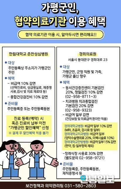 가평군은 대형 의료기관 이용 부담을 줄이기 위한 협약 의료서비스도 시행하고 있다. 한림대학교 춘천성심병원, 경희의료원 2곳과 협약을 맺어 군민이 해당 병원을 이용할 경우 비급여 진료비 등을 감면받도록 했다. 다만 협약 의료기관 감면 혜택은 예약 단계 또는 진료비 납부 이전에 신청한 경우에만 적용된다. 이미 결제가 완료된 건에 대해서는 소급 적용이 되지 않아 주의가 필요하다. 협약 의료기관을 이용해 감면 혜택을 받은 군민이 연간 4,000여 명에 달할 정도로 좋은 반응을 얻고 있다.