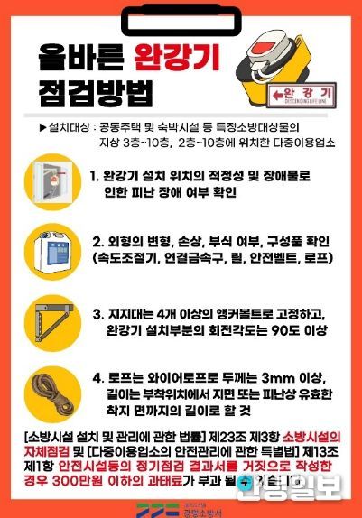 유해공 광명소방서장은 “완강기는 단순한 설치시설이 아니라 실제 위기 상황에서 생명을 지키는 중요한 피난장비”라며 “지속적인 교육과 관리체계 구축을 통해 시민 안전 확보에 최선을 다하겠다”고 밝혔다
