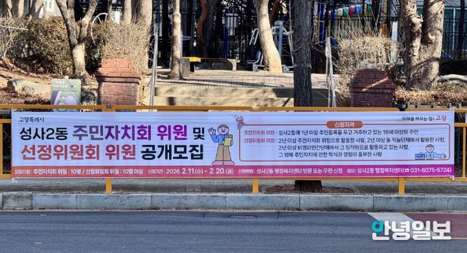 안녕일보 배윤 기자 | 고양특례시 덕양구 성사2동은 지역사회 발전과 주민 복지 증진을 위해 함께 봉사할 주민자치회 위원을 공개 모집한다고 밝혔다.