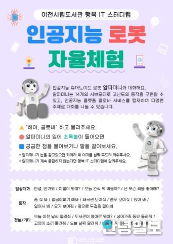 안녕일보 배윤 기자 | 이천시 시립도서관은 시민들이 인공지능 기술을 일상 속에서 자연스럽게 체험할 수 있도록 인공지능 로봇 자율체험을 2월부터 10월 중순까지 운영한다고 밝혔다.