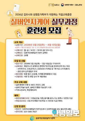안녕일보 배윤 기자 | 김포여성새로일하기센터가 초고령사회 진입에 따른 지역 내 노인 돌봄 서비스의 질적 향상을 도모하고, 경력보유여성의 성공적인 재취업을 지원하기 위해 ‘실버인지케어 실무과정’ 교육생을 모집한다.