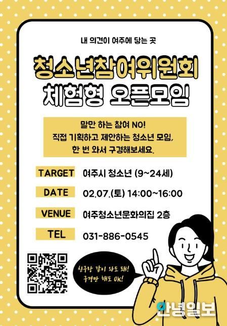 모집 대상은 여주시에 거주하거나 재학 중인 9세~24세 청소년이며, 모집 기간은 2월 18일까지이다. 선발된 위원들은 월 1회 정기회의 및 분과활동을 비롯해 정책 제안, 행사 기획, 청소년 사업 모니터링, 다른 지역 청소년참여위원회와의 교류 활동 등에 참여하게 된다.