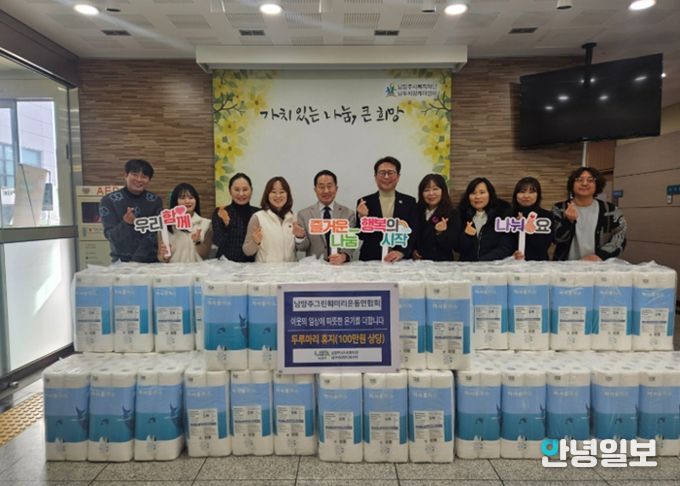 안녕일보 배윤 기자 | 남양주시는 지난 29일 남양주그린훼밀리운동연합이 남부희망케어센터에 지역 내 취약계층 지원을 위한 100만 원 상당의 두루마리 휴지 81묶음(1묶음 30개입)를 전달했다고 2일 밝혔다.