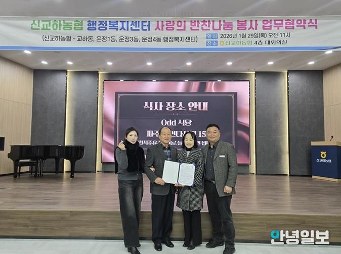 안녕일보 배윤 기자 | 파주시 운정1동 지역사회보장협의체는 지난 29일, 신교하농협 4층 대강당에서 신교하농협 고향주부모임과 함께 취약계층 식생활 지원을 위한 반찬 나눔 업무협약을 체결했다.