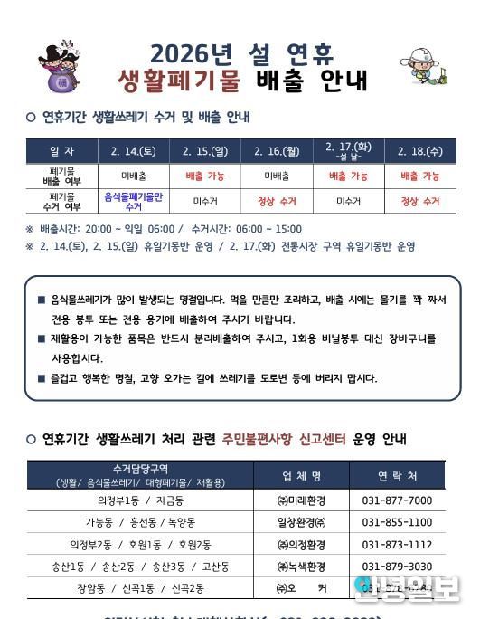 안녕일보 배윤 기자 | 의정부시는 설 연휴 기간 시민들이 쾌적한 환경에서 명절을 보낼 수 있도록 생활쓰레기 관리대책을 수립하고 청소대책 상황실을 운영한다.