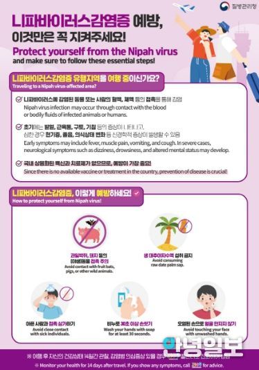 일산동구보건소 관계자는 “니파바이러스 감염증은 현재까지 백신과 치료제가 없고 치명률이 높아 사전 예방이 제일 중요하다”며 “설 연휴 해외에 방문할 경우 현지에서 동물 접촉과 비위생적인 음식 섭취를 피해야 한다. 특히 귀국 후 발열이나 신경계 증상 등이 나타나면 즉시 의료기관을 방문하고 보건소에 신고해 달라”고 당부했다.