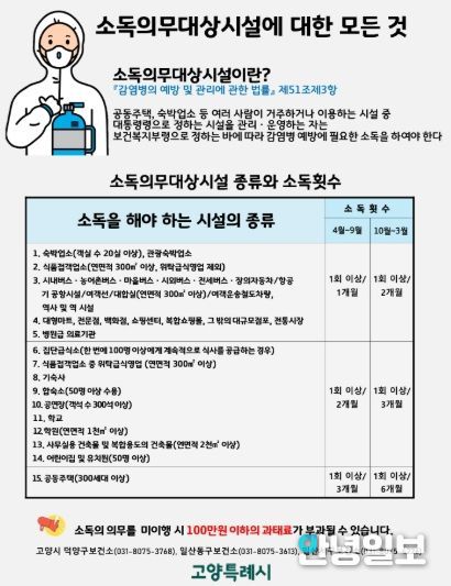 이에 고양시 3개 보건소는 소독의무대상시설에 소독기준과 횟수를 안내하고 소독실시 여부를 정기적으로 점검할 계획이다.