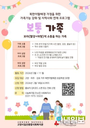 안녕일보 배윤 기자 | 고양시일산종합사회복지관이 북한이탈배경 가정의 가족기능 강화 및 지역사회 통합 프로그램 ‘보통 가족’의 참여자를 이달 18일까지 모집한다.