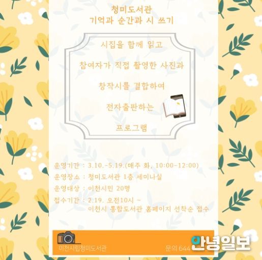 안녕일보 배윤 기자 | 이천시 청미도서관은 시민들이 직접 찍은 사진으로 시를 쓰고 전자책을 출판하는 ‘기억과 순간과 시 쓰기’ 프로그램을 운영한다.