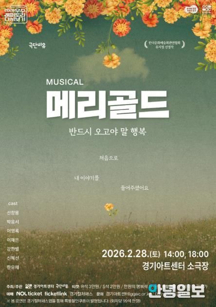 또, 경기아트센터 소극장에서 공연하는 뮤지컬 ‘메리골드’ 관람 할인 문화소비쿠폰이 지원된다. 공연은 오는 28일 토요일 오후 2시와 6시 총 2회 진행되며, 좌석 등급은 R석(3만 원), S석(2만 원), 만원의 행복석(1만 원)으로 구성된다.