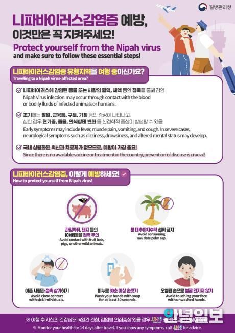 니파바이러스는 동물(과일박쥐ㆍ돼지 등)과 접촉하거나 오염된 식품(대추야자 수액 등)을 섭취하면 감염될 수 있으며, 환자의 체액과 밀접 접촉 시 사람 간 전파도 가능하다. 감염 초기에는 발열, 두통, 근육통이 나타나며 현기증, 졸음, 의식 저하 등 신경계 증상 및 중증으로 악화해 사망에 이를 수 있어 주의가 필요하다.