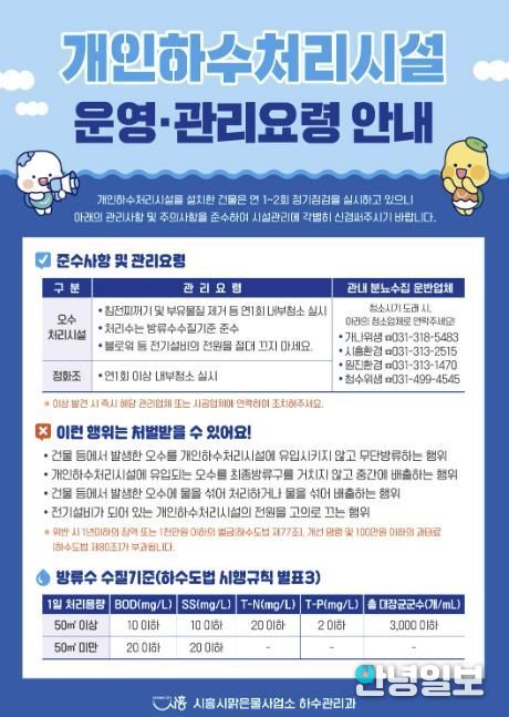 안녕일보 배윤 기자 | 시흥시는 하천 수질 오염을 예방하고 쾌적한 생활환경을 조성하기 위해 3월부터 관내 개인하수처리시설에 대한 지도점검을 본격적으로 실시한다.