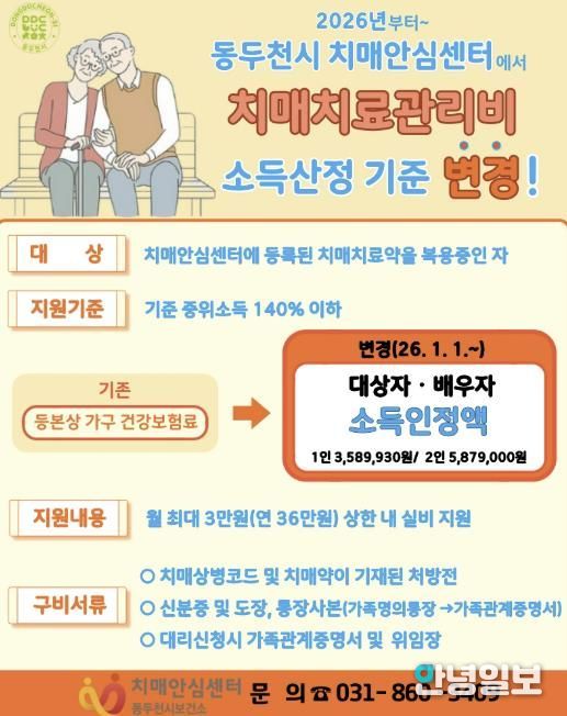 안녕일보 배윤 기자 | 동두천시 치매안심센터는 2026년 1월 1일부터 치매치료관리비 지원사업의 소득 산정 기준이 변경된다고 3일 밝혔다.