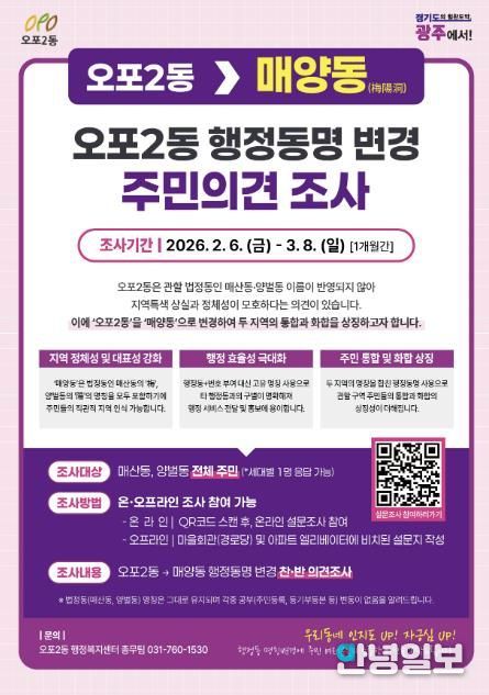 안녕일보 배윤 기자 | 광주시 오포2동은 지역 정체성을 반영한 행정동 명칭 변경을 위해 2월 6일부터 3월 8일까지 오포2동 전 세대를 대상으로 주민 의견 조사를 실시한다고 4일 밝혔다.