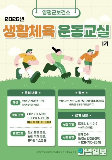 안녕일보 배윤 기자 | 양평군은 관내 등록 장애인을 대상으로 ‘2026년 장애인 생활체육 운동교실(1기)’ 참여자를 모집한다고 밝혔다.