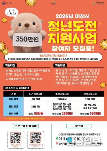 안녕일보 배윤 기자 | 이천시는 지역 내 미취업 청년들의 진로 탐색과 취업역량 강화를 위해 운영하는 ‘청년도전지원사업’의 참여자를 2월 4일부터 모집한다고 밝혔다.