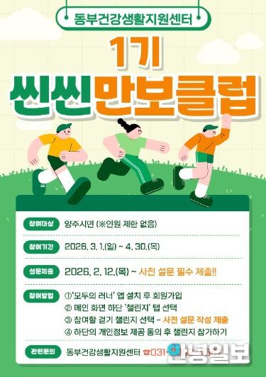 안녕일보 배윤 기자 | 양주시보건소 동부 건강생활지원센터에서는 지역 주민의 건강생활실천율 향상 및 비만율 개선을 위해 2026년도 ‘씬씬 만보클럽’ 1기 참여자를 모집한다.