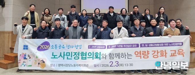 안녕일보 배윤 기자 | 평택시노사민정협의회는 지난 3일 분과위원회 및 실무협의회 위원을 대상으로 '2026년 노사민정협의회 통합회의 및 일·생활 균형을 위한 역량 강화 교육'을 평택시 장당노동자복지회관 대회의실에서 개최했다.