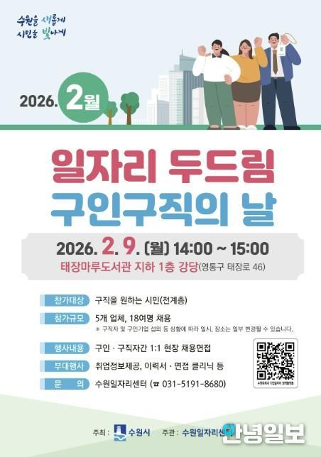 안녕일보 배윤 기자 | 수원특례시는 2월 9일 오후 2시부터 3시까지 태장마루도서관 강당에서 ‘2월 일자리 두드림 구인·구직의 날’을 개최한다.
