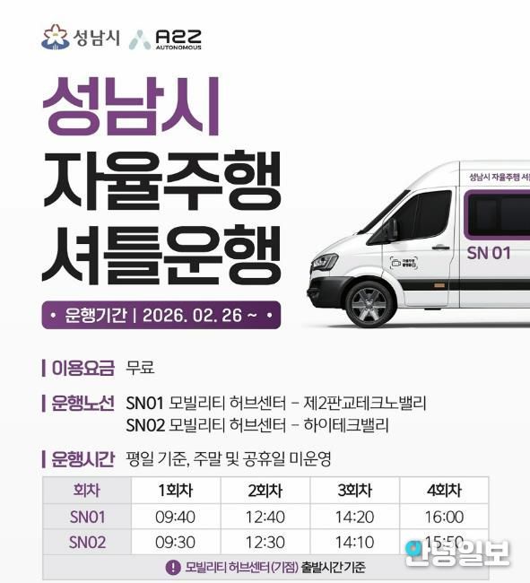 셔틀은 오는 2월 26일부터 운행을 개시해 2년간 시범 운영되며, 해당 기간 동안 시민 누구나 무료로 이용할 수 있다. 운행 시간은 평일 오전 10시부터 오후 5시까지로 하루 4회 운행되며, 차량 1대당 최대 14명까지 탑승 가능하다.
