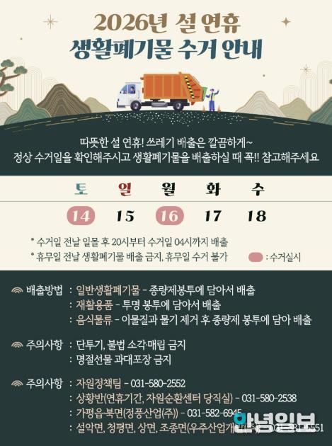 안녕일보 배윤 기자 | 가평군은 설 명절을 맞아 군민과 방문객 모두가 쾌적한 환경에서 청결한 연휴를 보낼 수 있도록 생활폐기물 처리 대책을 마련했다.