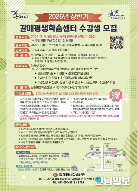 안녕일보 배윤 기자 | 구리시는 구리시평생학습관, 갈매평생학습센터, 수택평생학습센터에서 운영하는 2026년 상반기 평생학습 강좌의 수강생을 오는 2월 9일부터 모집한다고 밝혔다.