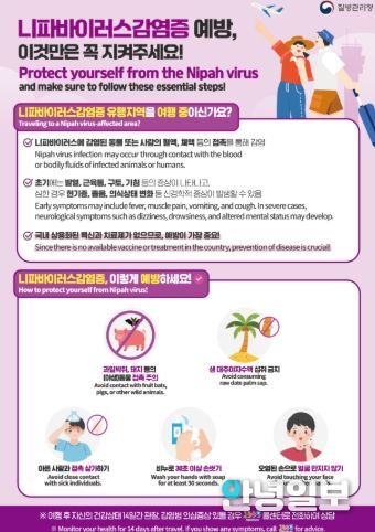 안녕일보 배윤 기자 | 이천시보건소는 니파바이러스 발생 국가(인도, 방글라데시 등)를 여행할 때 감염 예방을 위해 예방 수칙을 철저히 준수해 줄 것을 당부했다.