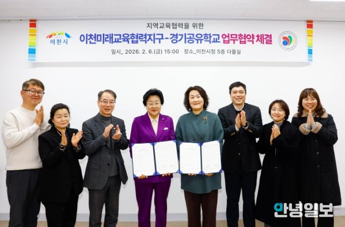 안녕일보 배윤 기자 | 이천시는 2월 6일, 2026년도 이천미래교육협력지구(경기공유학교 학교맞춤형) 사업의 원활한 추진을 위해 이천교육지원청과 ‘이천미래교육협력지구-경기공유학교 업무협약’을 체결했다고 밝혔다.