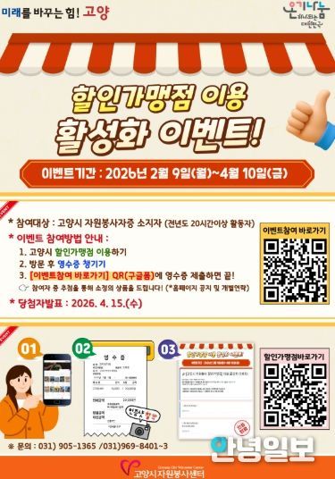 이번 이벤트는 관내 자원봉사 할인가맹점 179곳을 대상으로 진행되며, 지난해 20시간 이상 자원봉사 활동에 참여한 고양시 자원봉사자를 대상으로 한다.