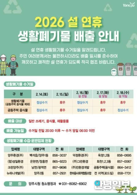 안녕일보 배윤 기자 | 양주시가 설 연휴 기간 시민과 방문객의 불편을 줄이기 위해 ‘2026년 설 연휴 생활폐기물 관리 대책’을 추진한다.