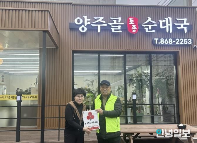 황인용 양주골순대국 대표는 “지역사회에 도움이 될 수 있는 일에 동참하게 되어 뜻깊게 생각한다”라며 매월 정기적으로 관내 취약계층 10가구에 식사를 지원하는 나눔 활동에 참여하겠다는 뜻을 밝혔다.
