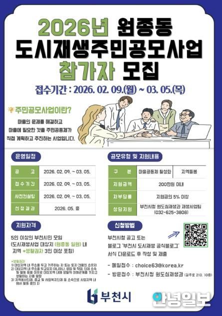 안녕일보 배윤 기자 | 부천시는 2월 9일부터 3월 5일까지 도시재생에 대한 주민 이해도를 높이고, 주민 주도의 사업 추진 역량을 강화해 지역 활성화와 공동체 발굴 등 주민 참여를 확대하고자 ‘원종동 도시재생 주민공모사업’ 참가자를 모집한다.