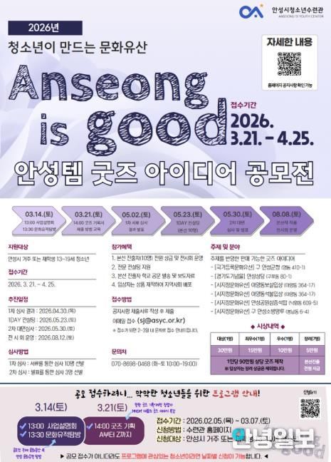 안녕일보 배윤 기자 | 안성시청소년수련관은 청소년이 지역 문화유산을 창의적인 굿즈로 재해석하는 '2026 청소년이 만드는 문화유산 ‘안성템 굿즈 아이디어 공모전’'을 개최하고, 오는 3월부터 참가 청소년을 모집한다고 밝혔다.