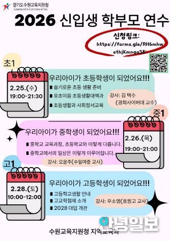 안녕일보 배윤 기자 | 경기도수원교육지원청은 오는 2월 25일부터 28일까지 사흘간 관내 초‧중‧고등학교 입학을 앞둔 예비 신입생 학부모를 대상으로'2026년 신입생 학부모 연수'를 운영한다.