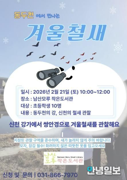 안녕일보 배윤 기자 | 동두천시 남산모루 작은도서관은 오는 2월 21일 오전 10시부터 정오까지 도서관 인근 신천에서 겨울 철새 관찰 프로그램을 운영한다.