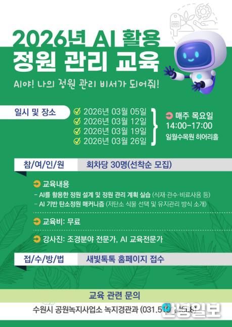 안녕일보 배윤 기자 | 수원특례시는 시민 정원가의 전문성을 높이고 스마트한 정원 문화를 확산하기 위해 ‘인공지능(AI) 활용 정원 관리 교육’을 운영한다.