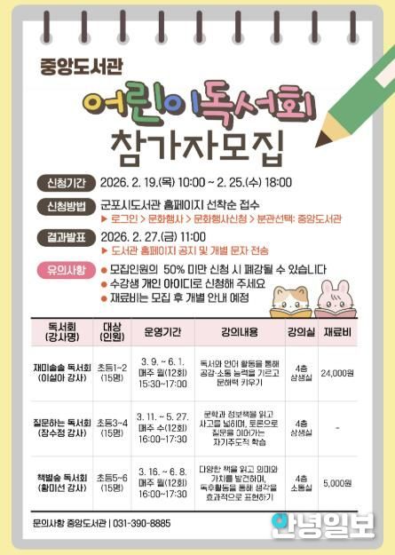 안녕일보 배윤 기자 | 군포시 중앙도서관은 독서를 통해 생각하고 함께 소통하며 올바른 독서습관 형성과 문해력을 키우는 아동 및 청소년 대상 독서회를 오는 3월 9일부터 6월 13일까지 운영한다.